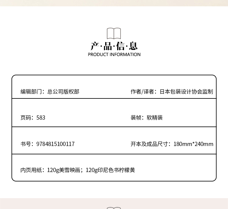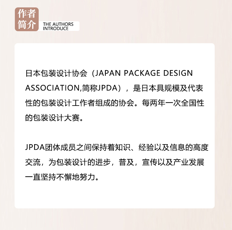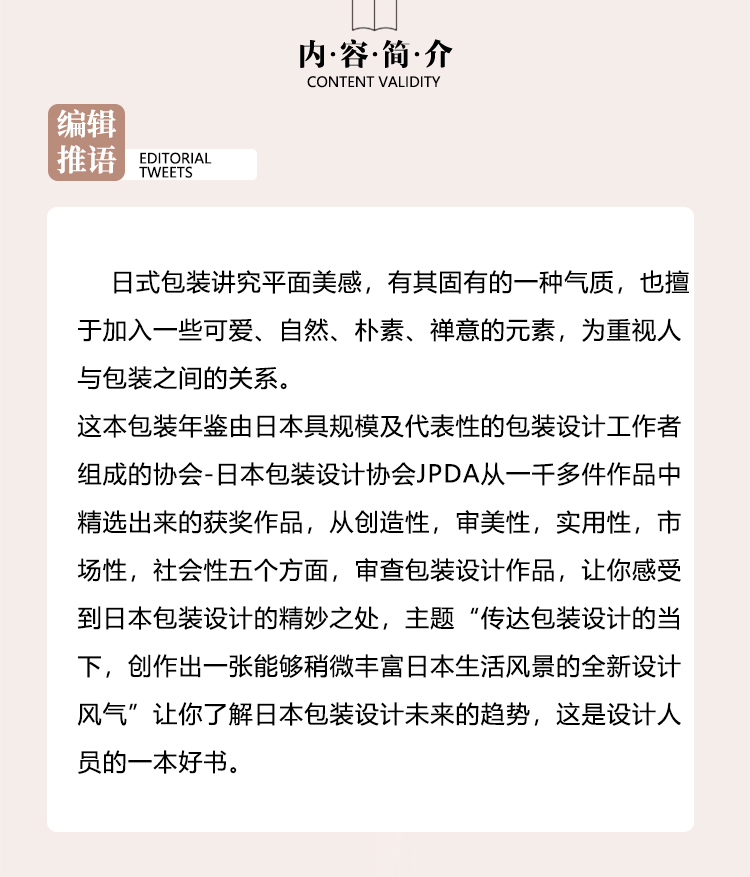 《Package Design in Japan Biennial Vol.19》从1000件应征的作品,严格筛选了数百件优秀的作品。 收录作品的类别包括:食品/酒精饮料/一般饮料/糖果/化妆品/香水/化妆品/家居用品,一般用品,药品/礼品,分类货物/运输箱/VI·BI /国外产品/电气设备/相关产品/纪念品/促销包装。 通过审视平成的设计,来考察未来的包装设计。 日式包装极其讲究平面美感,有其固有的一种气质,也擅于加入一些可爱、自然、朴素、禅意的元素,极为重视人与包装之间的关系。 这本包装年鉴由日本最具规模及代表性的包装设计工作者组成的协会-日本包装设计协会JPDA从一千多件作品中精选出来的获奖作品,从创造性,审美性,实用性,市场性,社会性五个方面,审查包装设计作品,做全方位的品鉴,让你感受到日本包装设计的精妙之处,主题“传达包装设计的当下,创作出一张能够稍微丰富日本生活风景的全新设计风气”让你了解日本包装设计未来的趋势,这是设计人员不可多得的一本好书